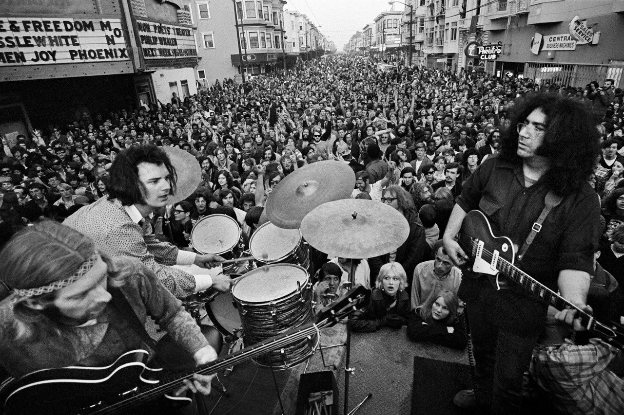 Later, as the San Francisco music scene became more established, people flocked from all over the country to the city’s Haight-Ashbury district. Performers and enterprising promoters began to replicate the Acid Test experience, first in free outdoor concerts, then commercially in dance halls. The Dead, along with compatriots Jefferson Airplane, Country Joe & the Fish, Quicksilver Messenger Service, and Big Brother & the Holding Company would play on stage to a crowd of dancers as light shows and videos projected over it all. This was the beginning of the multimedia rock concerts that are de rigueur today. Besides musical performances, these shows also included comedy acts, lectures on spirituality, art exhibitions, etc.. Eventually it all exploded, and they hit the national touring circuit.